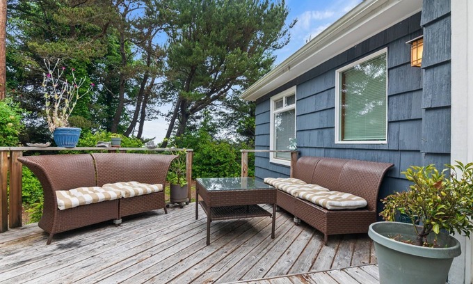 Enveloped in trees and local plant life, this family-friendly home is ready to welcome you (and your dogs!) to the coast. Don't let the trees fool you - you're just a short walk from the Spyglass Ridge Trailhead and the beach is less than a half mile away. You may even have a close encounter with local deer! Grilling out on the furnished patio is a must when you stay at this home.