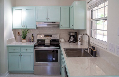 This charming coastal cottage is newly renovated and professionally designed. The kitchen is fully stocked with everything you need for meal prep and beach towels are also provided for your convenience. The washer and dryer are comfortably located in the carport unit. From the sunroom, you can walk out to the beautiful patio with a dining table and garden lights, perfect for outdoor dining. There is also a spacious backyard.