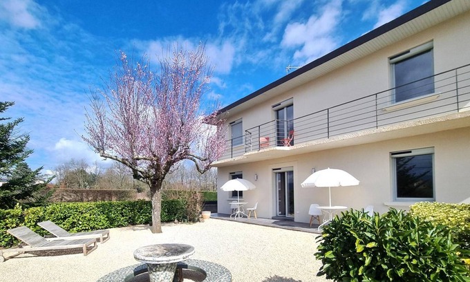 This 74m² cottage is located on the ground floor, raised by three steps. You enter the living room, which features a fully equipped and fitted kitchen, opening onto the dining area and relaxation lounge. Two charming bedrooms are carefully furnished with a 160x200 cm bed and equipped with a television. On the same level, there is a bathroom with a shower and double sink, as well as a separate toilet. In the heart of the Roanne region, Catherine & Jean-Yves welcome you to their beautiful contemporary villa in the Italian style of the 1960s. On the ground floor of their house, they have furnished and completely renovated this very comfortable stopover with a warm, modern feel. Ultra-spacious, the cottage features a bright living room overlooking the carefully landscaped 200m² private courtyard. There is secure, gated parking. To make your stay even more enjoyable: utilities and heating are included, beds are made upon arrival, and towels are provided.