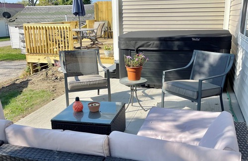 Our new patio and deck area are sure to be a delight as you take a soak in the hot tub, utilize the space for entertaining, or wrap up that euchre tournament with a win under the stars. The space is quiet and private and also includes a beautiful dining area on the deck and a comfortable seating area on the patio.