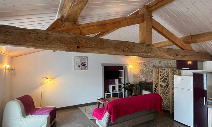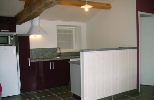 Gite for 2 people housed in a former stable, adjoining another gîte, located in a hamlet on a 3,000 m² enclosed property. Reception room on site. Ground floor: living room/lounge/kitchen, toilet. Access via 2 steps: 1 bedroom (1 double bed), shower room. Private 30 m² terrace (garden furniture, barbecue). Vélorail 500 m away. Optional: End-of-stay cleaning: €50/stay; Double bed linen rental: €10/bed/stay.