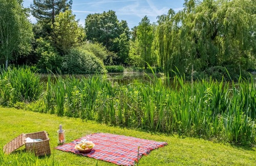 Large South-West facing lawned garden surrounded by mature shrubs. Via mowed paths is quick and easy access to a boating lake which can be used by guests to relax and have fun with. Beyond are fields, walks and woodland for exploring.