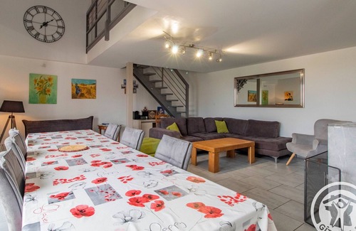 The gîte features a large, bright living room with a comfortable lounge, a dining area, and a fully equipped open-plan kitchen (oven, microwave, induction hob, refrigerator, etc.). A ground-level bedroom has a 140cmx190cm double bed and a small mezzanine (7m²) with two 90cmx190cm beds and one 90cmx190cm pull-out bed.