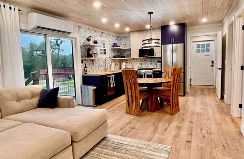 The main area is open, bright, and airy, and features a fully-equipped kitchen, table with seating for four, a full-sized washer and dryer, and a sectional sofa that comfortably seats four or more. Step out onto the covered front porch to enjoy your coffee in the rocking chair, or onto the deck where you will find a gas grill and breathtaking mountain views.