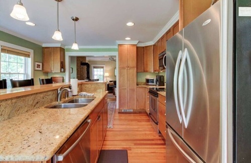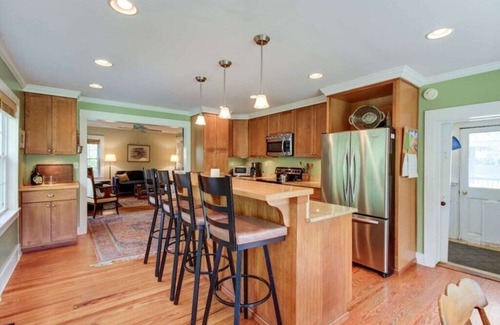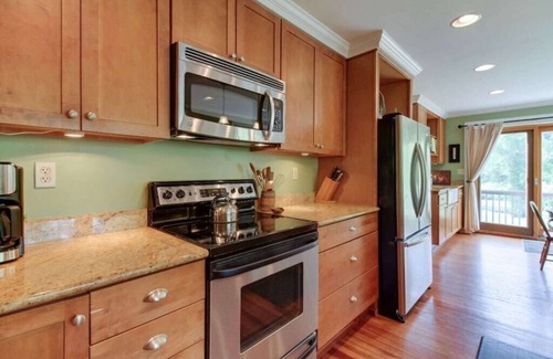 The house is easily accessible for guests of all ages as well as those with mobility challenges. The main floor features a living room with large flat-screen Smart TV. The living room is open to the large kitchen and dining area. The kitchen has a breakfast bar with seating for four and a dining table for six. Off the kitchen are two exits to the deck overlooking the 'crooked run'. The main floor also includes an additional bedroom with a Queen size bed and a full bath with tub and shower as well as a laundry room.