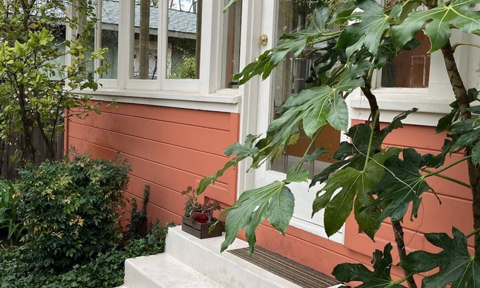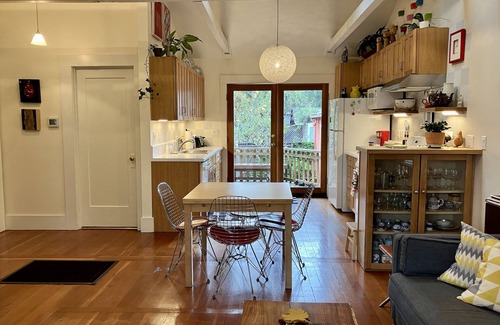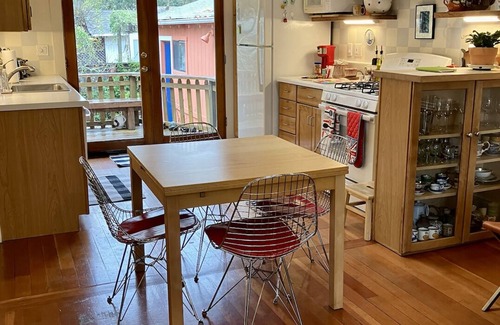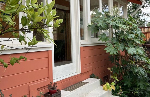 A cheerful front-covered porch invites you to enjoy the morning sun. High ceilings in the living room create space for a music salon. The original Douglas fir wood floor from the 1920s blends beautifully with the ebony grand piano. There are two bedrooms. The sofa bed in the living room and another sofa bed in one of the bedrooms can be used for additional guests. The fully equipped kitchen comes with a refrigerator, gas stove, microwave, coffee maker, and all pots and pans, utensils, dishes, and glasses you need. The bathroom has a shower/tub combination, and towels are provided. You are welcome to enjoy outdoor dining on the back patio, where you can also access the vegetable/herb garden, brick fire pit, and a comfortable chaise lounge.