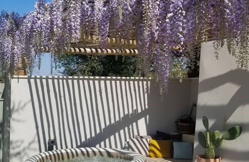 - Charming cottage for two, 40 sq. meters inside, and a huge private terrace (80 sq. m.) with jacuzzi, pergola, solarium, lounge chairs, dining table...