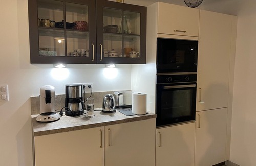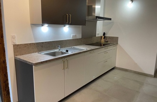 At your disposal, a large fully equipped kitchen with wood stove, a large living room with large screen, 2 sofas including a convertible for 2 people. Bathroom with large Italian shower, 1 sink. 1 independent toilet. A laundry room with washing machine and dryer.