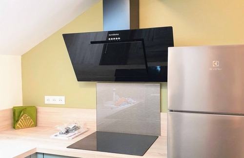 Entrance into a beautiful living room with a corner sofa and 120cm flat-screen TV. An open-plan, fully equipped kitchen includes a fridge-freezer, 4 ceramic hobs, a fan-assisted oven, a microwave, a dishwasher, and a Nespresso coffee maker.