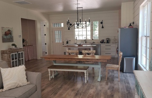 After a fun-filled day, unwind in this beautiful cottage nestled by tall pine trees and nature sounds. The home includes two bedrooms with queen size beds, two full size restrooms, kitchen with electric stove, refrigerator, dishwasher, washer/dryer and free wi-fi.