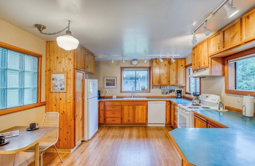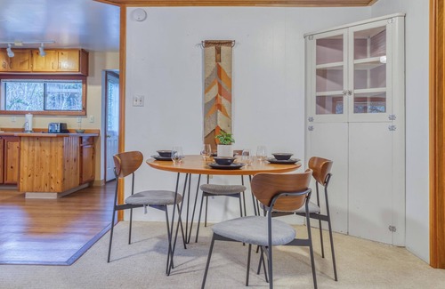 Nestled on a double lot in a forested residential neighborhood, Neakahnie Cottage is a 1920s charmer perfect for a cozy stay on the North Oregon Coast. Retro touches, including board-and-batten wood ceilings in the great room, and even a turntable with records, pair with modern updates, including a hot tub under a covered patio. It’s an easy stroll down quiet streets to the beach and the looming beauty of Neakahnie Mountain.