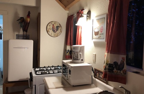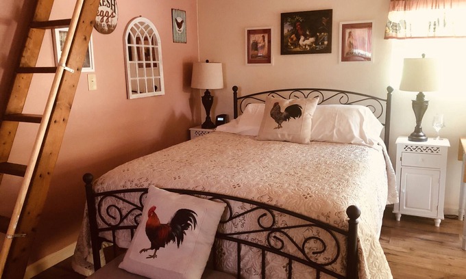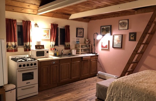 This little private Ranch Cottage is a charmer! Freeway close on a dead end country road you’ll find a lovely farm setting with friendly animals nearby. This studio has a sleeping loft as well, with air mattress and twin futon for sleeping options. Ground floor has a deluxe queen bed, fold out futon, complete kitchen, free WiFi, flat screen tv, full bathroom, and a cedar deck with lounge chairs, swing seat, and a charcoal grill.