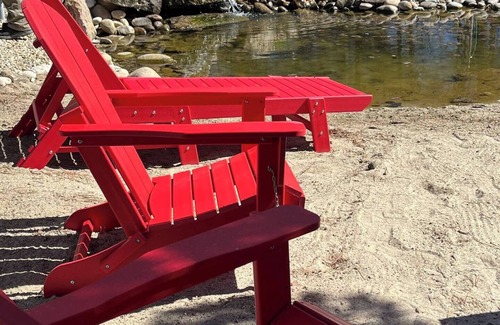 You will have access to: gas fire pit on mini beach, cold plunge pond with waterfall, 12 person hot tub, Adirondack chairs and recliners on sand, in-ground trampoline, tetherball, hammock, private patio set outside your bungalow back door.