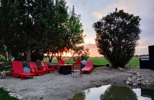 Charming country cottage in a peaceful rural setting—perfect for a romantic escape or quiet getaway. Relax in the hot tub, on the mini beach, or by the pond with a waterfall. Enjoy sunsets from the fire pit or private patio, with evening lighting and the sounds of wild birds all around.