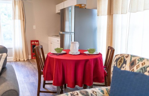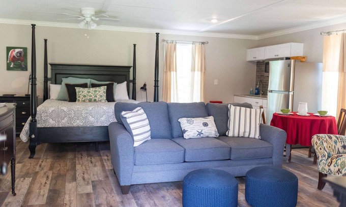 This spacious one-room cottage features a luxurious King-sized bed and a convenient Queen-sized roll-out with a memory foam mattress, ensuring comfort and relaxation during your stay. Enjoy modern amenities, including a kitchenette equipped with a microwave, full-size refrigerator, and a Keurig coffee maker for that perfect morning brew. A key-pad coded door lock adds ease and security, allowing you to focus on what truly matters—your wedding celebration.