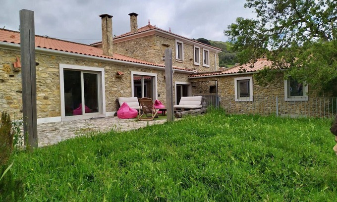 Located between Lisbon and Mafra, Quinta da Azenha is a charming stone house of 150 m2 plus a terrace and a large garden with a view on an uninhabited hill. The Lizandro stream flows at the bottom of the land. You can explore the hill on foot, meditate by the river, or take a nap in one of the two hammocks. The little ones will certainly appreciate the tree house with its zip line, basketball hoop and swing.