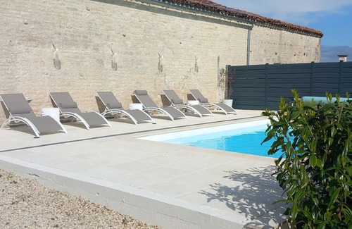 Relax and unwind in this spacious and peaceful old winery on the border of Charente-Maritime & Charente, only an hour from the coast & half an hour from Angouleme. Nestled among vineyards and sitting on an acre of mature gardens, this lovely Charentaise house offers space for 7 people to enjoy the French countryside. There are a number of options for alfresco dining, a private heated pool, a BBQ and firepit, and for the cooler evenings there is a wood burning stove in the main living room.