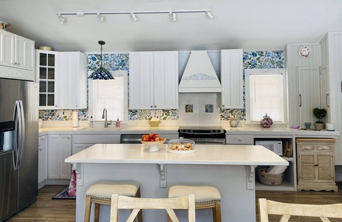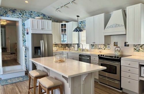 Fully renovated, this cottage features a large kitchen with everything needed to prepare all kinds of meals. In addition to the cottage, the seasonal She Shed, and a one car garage are available for you. (The room above the garage you see in the photo is storage only.)