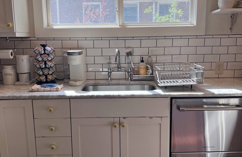 High ceilings, hardwood floors, retro-modern "foodies" kitchen, equipped with everything you need for a wonderful stay. Real wood fireplace, central AC, 55" TV. Fiber optic internet. One BD has a Cal King, one BD has a King + a twin.