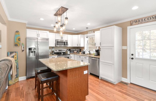 - Fully Equipped Kitchen: The chef's dream kitchen boasts stainless steel appliances, a huge center island, and farmhouse-style dinnerware, allowing you to host brunches or casual meals for family and friends.