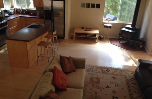 Our open plan living area is great for entertaining and the kitchen has concrete counter tops and plenty of room. We have used it before as a yoga retreat as it is a beautiful and secluded place. Outdoor dining in the summer on the deck or just laying in the hammock as the sun goes down. Our 3 bedroom home has 1 king bed, 1 queen, 2 double beds. Also available is a double futon and 2 double air beds. There is a bathroom downstairs and a bathroom upstairs in the queen bedroom