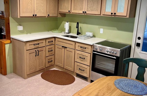 Escape to Creekside Mountain Cottage, where rustic style meets modern comfort. The open living area has a sleeper sofa for 2 adults and the chaise is suitable for 2 children under the age of 10 to sleep on. Gather in the cozy lounge, prepare meals in the stocked kitchen, and enjoy tranquil moments by South Fork Creek. A perfect retreat for couples, families, or friends.