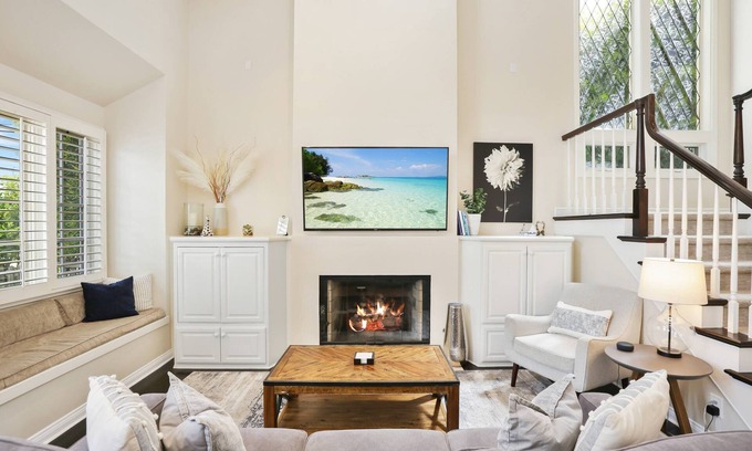 The home has a bright open floor plan. This common living space is made up of a living room, kitchen, and dining area. The living room showcases soaring high ceilings. A plush couch and additional seating are arranged around the fireplace and mounted flat screen TV. Light the fire as the coastal breeze picks up at night to create a cozy ambiance. Relax on the couch with your loved ones and catch your favorite program or movie on TV.