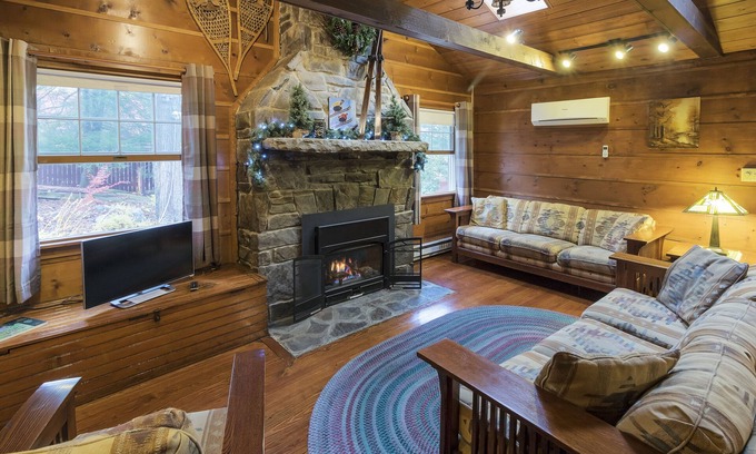 This mountain cottage is the former home of the manager of the neighboring ski resort, and has many luxury amenities. It has been completely renovated and practically everything is new, while retaining lots of mountain charm. The living room features a 2 story stone fireplace with tongue and groove atrium ceiling, skylights, and 2 mission style sofas, recliner, Large Smart TV with free on-demand video access and WiFi access.