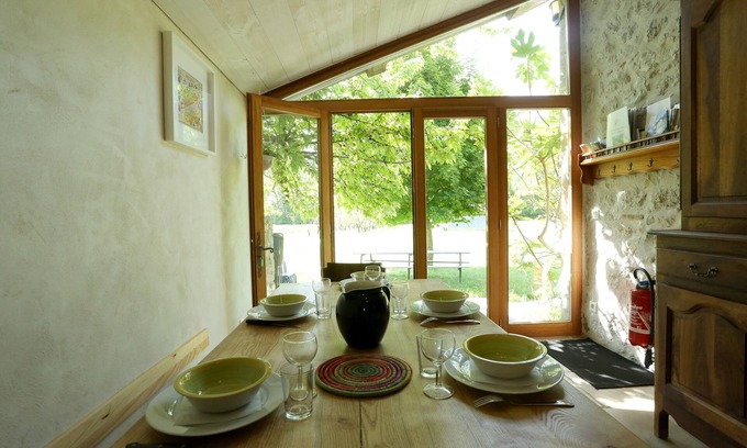 The house has a private terrace and a barbecue overlooking our huge garden. Let yourself go to a nap under a tree or by the river when it's hot or opt for a game of petanque, foosball or balance on the slackline.