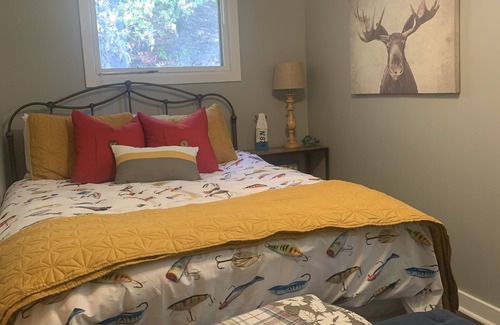 The private dock is a perfect spot to dip your feet in the water and maybe cast even cast a fishing line. (Please note: The owners keep their private boat there for part of the year. If guests bring or rent a boat, they will need to park it uncovered on the north side of the dock. That spot accommodates up to roughly a 25' boat.)