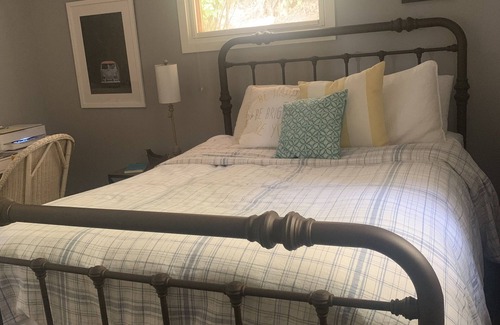 Bedroom 2 features a queen bed, nightstand and lamp, cozy seating area, and temperature control with a mini-split unit.