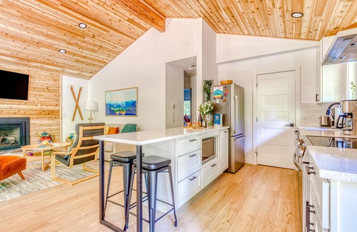Inside, you’ll find a space just as lovely. Stylish furnishings create a modern-cabin vibe, and the vaulted, wood-paneled ceilings and open layout make the area live large. And you’ll enjoy abundant natural light and the same tree-lined view thanks to the wall of windows onto the deck. The full, sleek kitchen makes meal prep a breeze, and there’s room for everyone at the window-front dining table. Stay close to home with a game of cornhole or darts, or spend the day hiking any of dozens of nearby trails, playing golf, waterfall peeping, mountain biking, or skiing in the winter, then come home to warm up in front of the gas fireplace. A boot warmer in the shed comes in handy to dry, wet skiing or hiking boots after a day of exploration. Guests traveling with dogs will appreciate the provided towels and blankets. Indoor entertainment options include free WiFi, board games, and two streaming-capable TVs. But the best way to end the night is back outside, soaking in your private hot tub under the starry sky.
