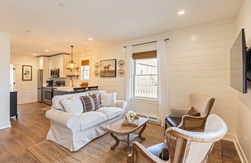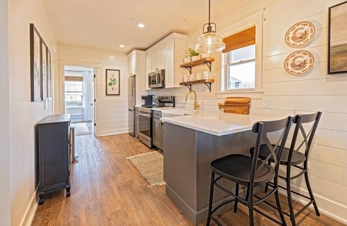This stylish first-floor apartment features a king-size bed, a spacious living area, and a large bathroom boasting a Carrera marble shower surround, making it a perfect retreat for newlyweds or couples in the wedding party. The fully equipped galley-style kitchen with brand new Samsung appliances allows you to prepare light meals or snacks as you prepare for your big day. Enjoy the inviting wraparound porch and serene private backyard seating area, where you can unwind amidst tranquil surroundings after all the wedding festivities.