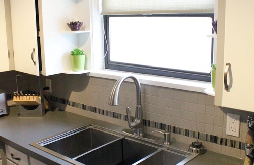 The bathroom features fresh soft towels, a full tub/shower combo with new fixtures, and a dual-flush toilet! We’ve designed the bathroom to be bright and airy, with a large glass-block window that shines on a vivid color palette and a shiny white shower surround.
