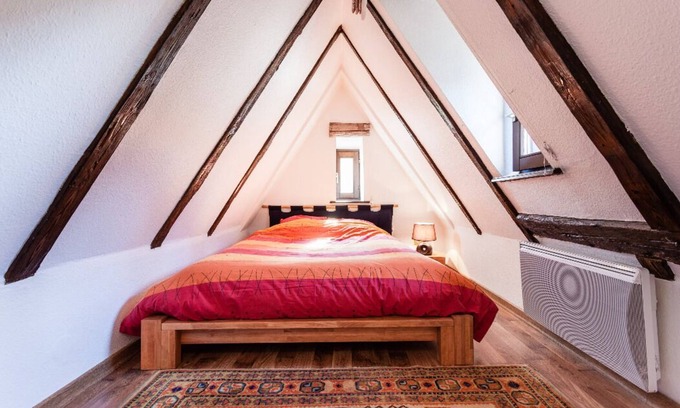 The apartment was built in the attic (4th floor without elevator) on two levels with an internal staircase and exposed beams. The building, dating from 1596, is located in the center of Strasbourg on the UNESCO World Heritage Island.