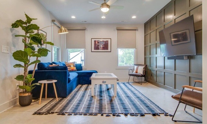 Discover the inviting charm of our East Nashville duplex, blending modern comforts with cozy allure. Perfect for large gatherings of up to 20 guests, relish in shared meals within our open-concept kitchens and unwind in snug living areas. Explore nearby Nashville delights by day and immerse yourself in the vibrant nightlife of Broadway by night. Create unforgettable memories at our perfect winter retreat!