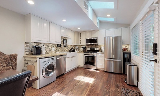 Your intimate hide-away is packed with high-end amenities, quaint charm and unexpected nooks and crannies. Its bright French doors serve as your private entrance and also flow onto your own secluded outdoor space, which is laced with lovely filtered light from the many oak trees that populate our yard. It is so much better than an extended stay! Most ideal for one car only.