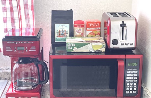 • Fully equipped kitchen: stainless appliances, fridge, stove, cook tools, microwave, blender, coffee maker, toaster, plate ware, glasses, wine opener, salt, pepper, oil, sugar, coffee, cream, tea