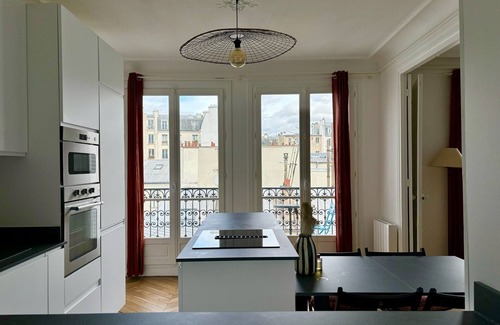 A spacious apartment, refurbished in 2023, on the 5th floor with elevator, comprising three light-filled bedrooms with a magnificent balcony offering a breathtaking view of Montmartre and allowing you to enjoy your breakfast or aperitif at sunset.