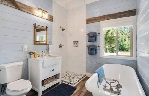 An old-fashioned claw foot tub greets you as you enter the bathroom, with separate shower, single vanity, and barn wood details reclaimed from the property itself.