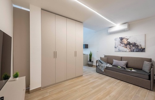 Double glass doors open into the spacious living area, which is furnished with a contemporary sofa, dining table for 4 people and a new, fitted kitchen. The kitchen is well-equipped with an induction hob, oven, fridge, freezer and coffee machine. Separated from the kitchen by a large wardrobe, there is another seating area with a sofa and flat-screen TV.