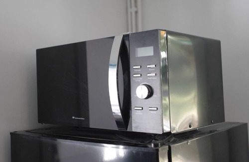 Kitchen equipped with microwave oven, electric hob, washing machine, pan tostador, coffee machine, refrigerator.