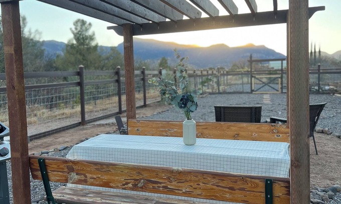 Located in Sierra Vista, Take it easy at this unique and tranquil getaway. Our Garten Haus has a huge Garage door to allow the outside in whenever you’d like. Open it to experience the sunrise each day right inside your living room.