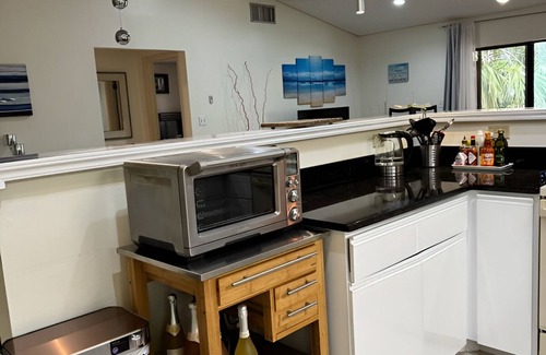 The kitchen is equipped with refrigerator, stove, microwave, dishwasher, garbage disposal, coffee maker, mixer, toaster oven, cooking and dining utensils and sets.