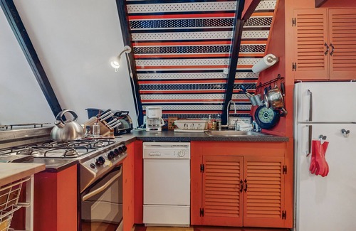 With a glass door wood stove that allows you to enjoy watching the fire, and plenty of firewood to warm you during your stay, the cheerful retro interior is fully outfitted. The open kitchen features a gas stove/oven, refrigerator, microwave, toaster oven, coffee maker, and dishwasher, making meal preparation a breeze. Enjoy the view from the large pine slab dinner table positioned against windows that overlook the deck, or snuggle up on the couch to take in a movie on the smart TV.