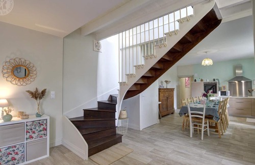 Individual gîte of 120m² on two levels. On the ground floor, you enter the spacious and bright living room: fitted and equipped kitchen open to the dining area and the living room (sofa bed) - a complete bathroom (Italian shower - sink - WC). Upstairs we find the two night rooms which have been decorated in soft tones to invite you to rest: the Lilas room: 4 people with a 160 bed and two 90 beds on the mezzanine accessible by a miller's ladder and the Jonquille room: 4 people with a 160 bed and two 90 beds - a complete bathroom (Italian shower - sink - WC). At the gîte "Chez Marinette", a real cozy nest, you will find all the comfort for a quality stay with family around the beautiful dining table or with friends in the cocooning lounge with its wood stove. You'll enjoy a secure, enclosed 1400m² garden where you can dine in the shade of the linden tree, play on the pétanque court, relax under the covered porch, unwind year-round in the sauna, or indulge in a read on a sun lounger. For added comfort, utilities, bed linens, and towels are included, and beds are made upon your arrival.