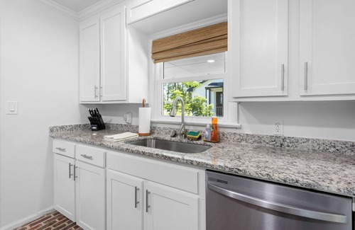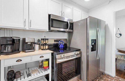Enter from the sunroom, through original pocket doors, into the living room or the kitchen. In the fully stocked kitchen , enjoy the coffee bar equipped with a Breville Barista Espresso Maker, Tea, and coffee maker. Also provided are all the kitchen utensils and cookware necessary to make a wonderful meal. You may also decide to grill your meal on the easy to use gas grill sitting on the patio.