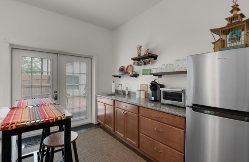 Your stay at the Charming Guest House comes complete with desirable amenities that elevate your experience. The cozy cottage features a quaint kitchenette equipped with a refrigerator, toaster oven, microwave, and a Keurig coffee machine, ensuring you have everything you need for a delightful morning. You will appreciate the peaceful courtyard with a fountain, perfect for sipping coffee or enjoying a glass of wine outdoors. High-speed internet and a smart TV provide entertainment options during your downtime. Additionally, the property is closely monitored for security, allowing you to relax and focus on your special occasion.