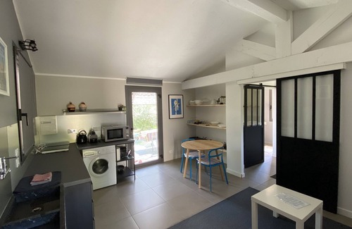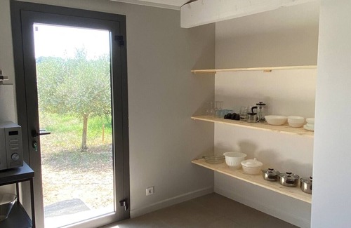 35 m2 space with living room, kitchen (two induction hobs, microwave/oven, refrigerator, dishwasher, laundry machine, coffee machine (Nespresso) and electric water heater), bedroom with L 160 bed, television, bathroom with shower and toilet. Reversible climate control. Sheets and towels are provided. The terrace at the south side overlooks the garden with a view of Mont Ventoux.