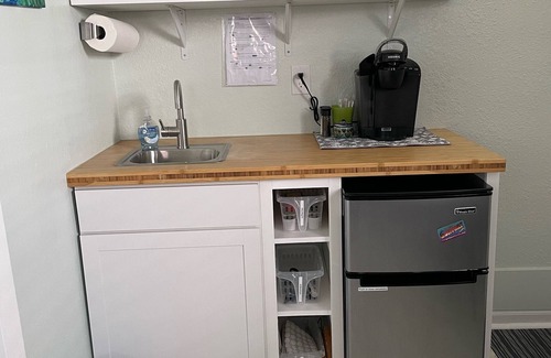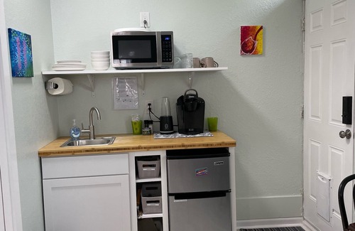 Escape to this charming Gulfport cottage just steps from the beach, restaurants, art walks, and live music. This cozy one-bedroom retreat offers a peaceful patio, a kitchen, and all the comforts of home. This Vacation cottage studio near St. Pete is ideal for couples, solo travelers, or remote workers looking to explore St. Pete and the laid-back Gulfport vibe. Walk to everything—no car needed! Quiet beachy studio cottage is located one block from the Gulfport Florida Library in the heart of the historic Art District near St. Petersburg. Lined with brick roads, surrounded by parks, and a short 5 block walk to the beach on Boca Ciega bay. Ample off street parking for up to two cars.